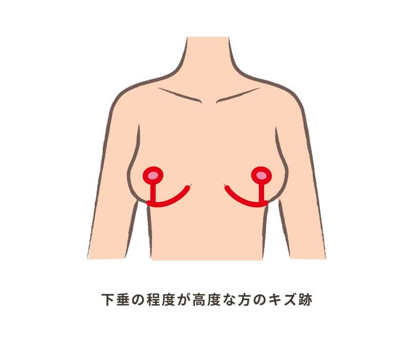 乳頭がアンダーラインの線より下にある場合は、胸の皮膚に傷が残り、余った皮膚と脂肪や乳腺を切除します。下垂の程度で皮膚の切開線は変わってきますので、まずご相談下さい。